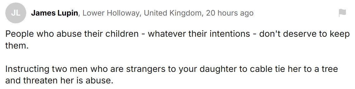 “无论有什么动机,虐待儿童的人都不配拥有孩子。指使两个陌生男子把女儿绑在树上还威胁她,这就是虐待行为。”