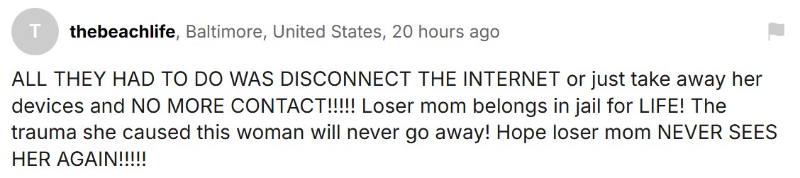 “他们只要断网或者没收女儿的手机就行了,这样她就再也联系不上骗子了!!这个废物妈妈应该坐一辈子牢!她给女儿造成的创伤永远无法抹去!希望这个废物妈妈永远无法再见到女儿!!”