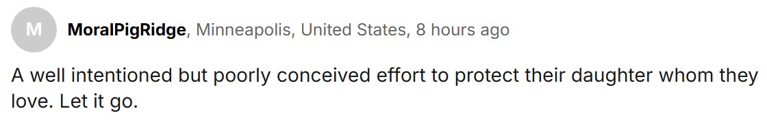 “初衷是好的,只是考虑不周,他们的目的是保护自己深爱的女儿,就让这事过去吧。”