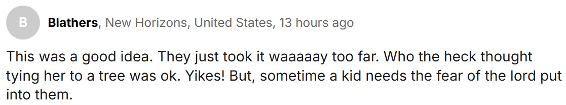 “这个点子不错,就是做得太过火了。谁出的主意把孩子绑在树上啊?我的天!不过有时候孩子确实需要被好好震慑一下。”