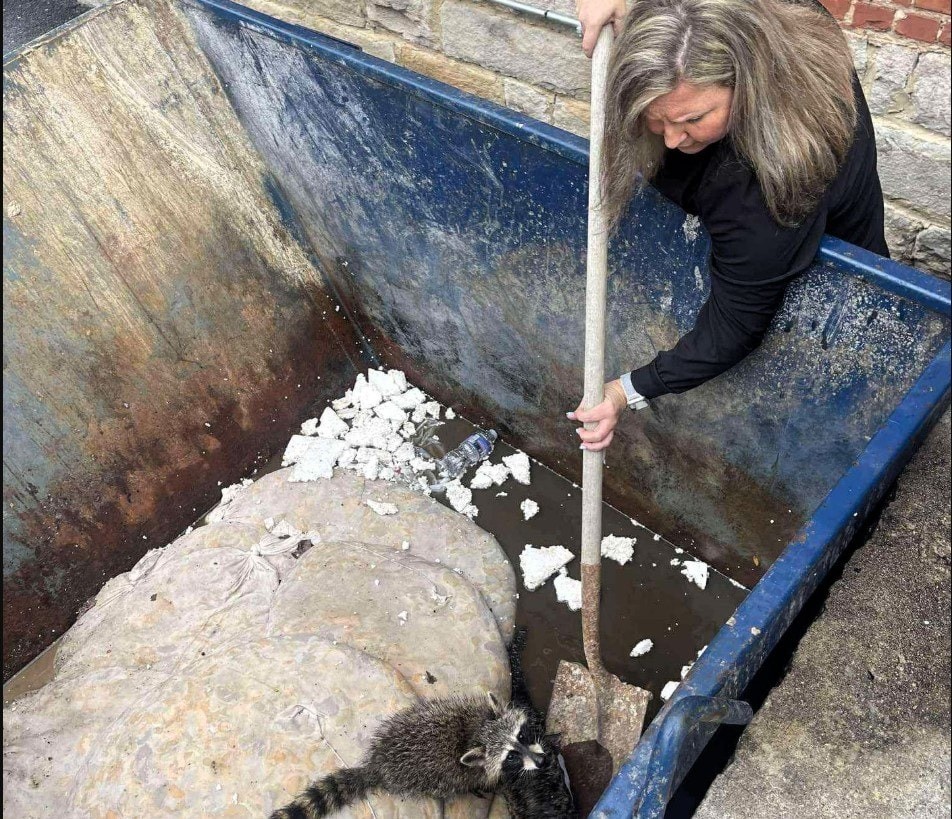 米斯蒂在垃圾箱里发现了两只小浣熊。她和同事先用铲子铲出来一只浣熊,它很快跟着那只体型较大的浣熊一起跑了。