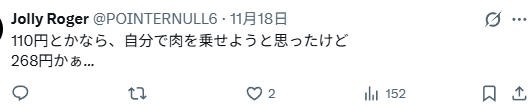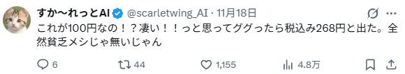 “我一开始以为这个‘只要100日元(约合人民币4.5元)?!太棒了!!’然后我查了一下,发现含税要268日元(约合人民币12元)。完全就不是‘穷鬼饭’。”