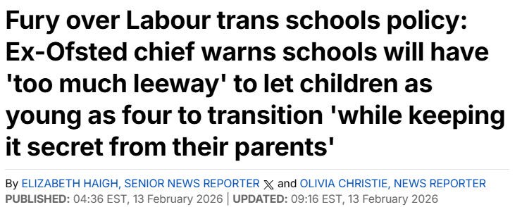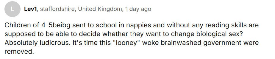 让4、5岁还穿着尿不湿、毫无阅读能力的孩子去上学,就指望他们能决定是不是要改变生理性别?简直荒谬至极。是时候让这个被觉醒思想洗脑的‘疯子’政府下台了。”