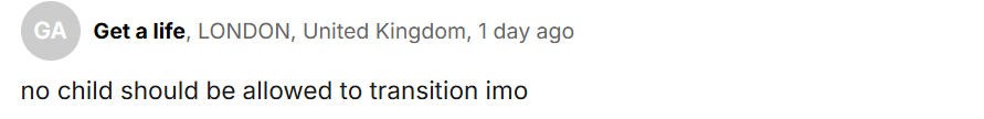 “父母告诉孩子必须要再等等,这或许是完全正确的,但一个不想再等的孩子可能会受同龄人、活动家、相关运动团体的鼓舞,告诉学校他们在家里感觉不安全,以便学校允许他们变性。”