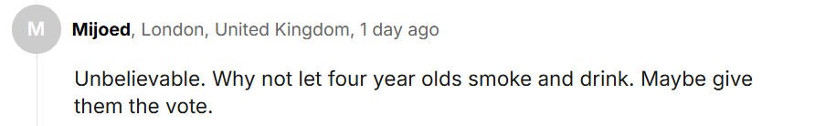 “不可思议。怎么不让4岁的孩子抽烟喝酒呢?要不给他们投票权好了。”