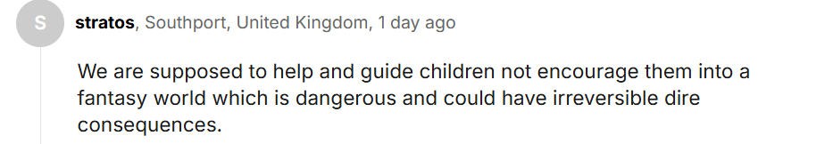 “我们应该帮助和引导孩子,而不是鼓励他们进入一个危险的幻想世界,这可能会造成无法挽回的严重后果。”