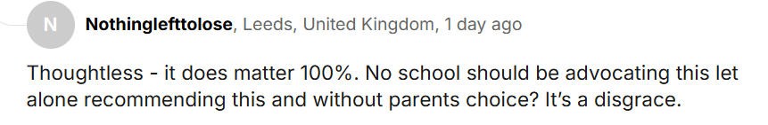 “考虑太不周全了——这是100%能肯定的。任何学校都不应该提倡这种做法,更不用说推荐这种做法了,而且还是在不给家长选择权的情况下?这简直太可耻了。”