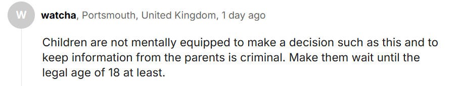 “未成年人心智尚未成熟,无法做出这样的决定,对父母隐瞒信息是犯罪。至少要等他们年满18岁才能做决定。”