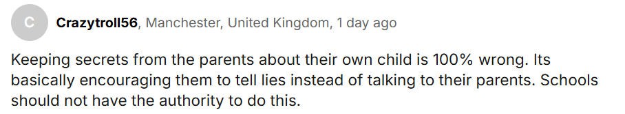 “对家长隐瞒他们孩子的情况是100%错误的。这其实是在鼓励孩子撒谎,而不是和父母沟通。学校不应该被赋予这种权力。”