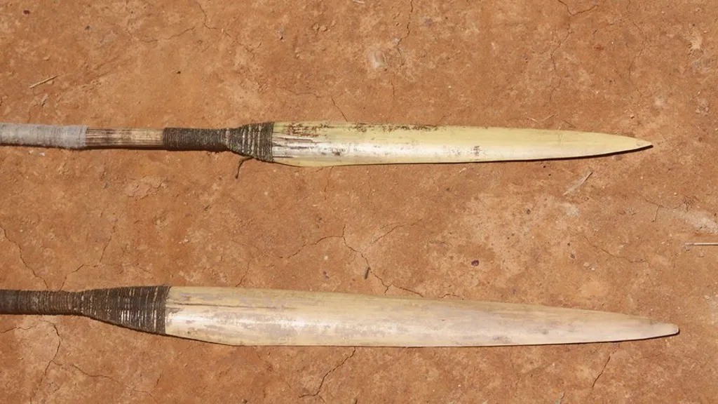 他们的脸上涂着红色和黄色的战纹,头发又长又乱。手里拿着长矛,身后背着长长的弓箭,箭尖是削尖的竹子。