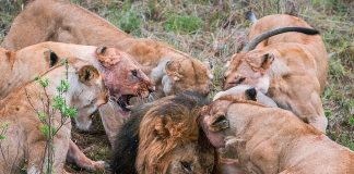 狠!公狮想抢孩子的食物,被母狮凶狠围殴咬掉一颗蛋!